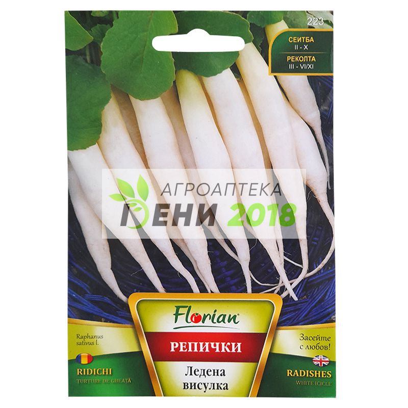 Репички ледена висулка . Този сорт репички се отличава със своите атрактивни издължени, бели и вкусни плодове. Екзотичен сорт репички предназначен за отглеждане на открито и в оранжерии. Растението образува розетка, а плодовете са издължени, крехки, с тънки опашки и атрактивен наситен бял цвят. Месестата част е вкусна, крехка и сочна. Вегетационен период: 80 - 90 дни. Указания за отглеждане: Тип производство: пролетно и есенно Срок на сеитба: Пролетно: февруари - април Есенно: септември - октомври Дълбочина на сеитба: Пролетно: 2 - 2,5 см Есенно: 2 – 2,5 см Разстояние: Пролетно: 50/10 – 20 см Есенно: 50/10 – 20 см Сеитбена норма: 2 – 3 кг/дка Оптимално температура на почвата за поникване: 3оС Разфасовка: 5 гр. Семена в 1гр : 125 - 150 бр. Семена в една опаковка: 625 - 750 бр.