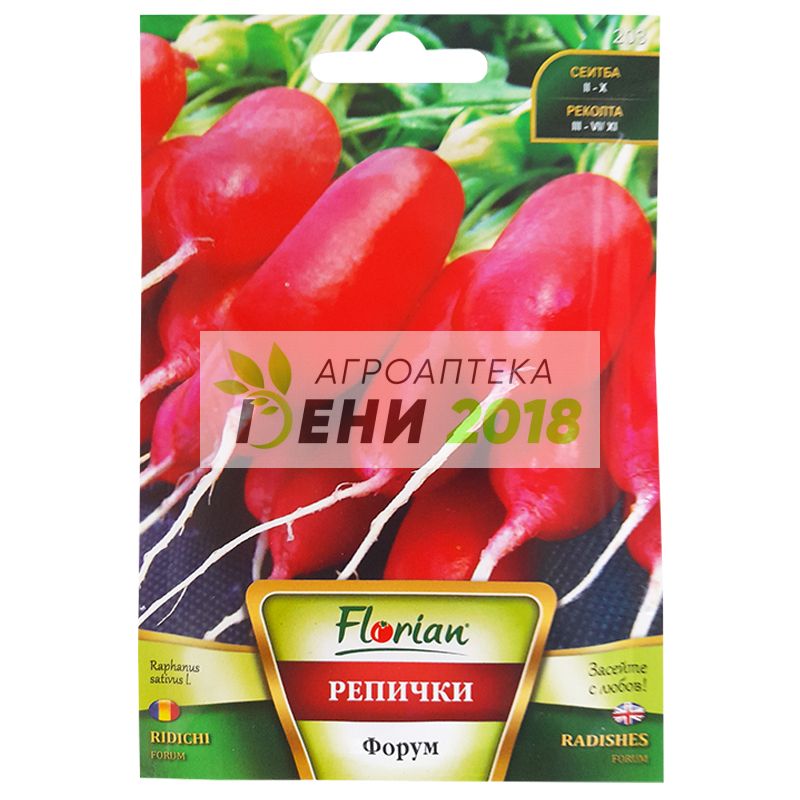 Репички Форум (червени, дълги) . Този сорт репички се е с много интересна издължена форма с наситено розово-малинов цвят. Ранен сорт репички, предназначен за пролетно и есенно отглеждане, на открито и в оранжерия. Кореноплодът е продълговат с наситен розово-малинов цвят. Успойчив на напукване, с бяло месо и с отлични вкусови качества, сочни и нелютиви. Подходящи са за прясна консумация, с отлични вкусови качества. Вегетационен период: 30 - 35 дни. Указания за отглеждане: Тип производство: пролетно и есенно Срок на сеитба: Пролетно: февруари - април Есенно: септември - октомври Дълбочина на сеитба: Пролетно: 2 - 2,5 см Есенно: 2 – 2,5 см Разстояние: Пролетно: 50/10 – 20 см Есенно: 50/10 – 20 см Сеитбена норма: 2 – 3 кг/дка Оптимално температура на почвата за поникване: 3оС Разфасовка: 3 гр. Семена в 1гр : 120 - 150 бр. Семена в една опаковка: 360 - 450 бр.