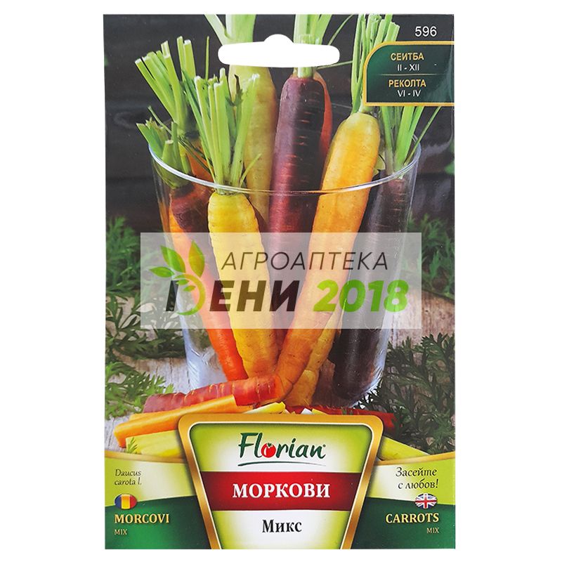 Моркови Микс . Този микс от моркови, освен че е много атрактивен със своите разноцветни кореноплоди е и много вкусен. Микс от моркови с разнообразна гама от плодове, чиито вътрешна част и кора са с цветове от бяло до наситено жълто и лилаво. Лилавите моркови имат наситен цвят почти до ядрото, който запазва цвета си и по време на готвене. Сладкият им вкус и атрактивни цветове ги прави идеална добавка към свежи салати и готвени ястия. Вегетационен период: 75-80 дни Указания за отглеждане: Семената се засяват: Ранно производство: 20 февруари – 15 март Предзимно: 01 – 15 декември Дълбочина на сеитба: 2 – 3 см Разстояние: 60/25 см Сеитбена норма: 450 - 600 гр/дка Оптимално температура на почвата за поникване: 5оС Разфасовка: 0,6 гр. Семена в 1гр : 800 - 1000 бр. Семена в една опаковка: 480 - 600 бр.
