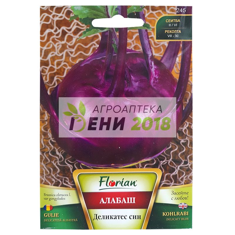 Алабаш деликатесен син. Късен сорт алабаш, образуващ едри, плоско-кръгли, синьо-виолетови стъблоплоди, достигащи тегло 250-350 гр. Крехък и ароматен зеленчук, не съдържа мазнини, има малко калории и ниско съдържание на натрий, които го прави полезен диетичен продукт. Има добра трайност до 30 дни след узряване. Устойчив е на нацепване. Обича хладен и влажен климат. Добре се развива при температура 17-22С. Високите над 25С температури се отразяват неблагоприятно на растежа му. Късното му отглеждане е по-рентабилно, получават се по-качествени стъблоплоди с добри вкусови качества и по-високо съдържание на захари. Алабашът има по-висока хранителна стойност от главестото зеле. Брането на Алабаша става след като достигне размер около 7 - 8 см в диаметър. Консумира се в прясно състояние. Вегетационен период: 150 – 160 дни Указания за отглеждане: Семената се засяват: При ранно производство 15 – 20 февруари (отопляемо) При късно производство 5 – 15 юни на открито Разсаждането при ранно производство е около 20 март – 5 юни, а при късното от 10 до 15 юли. Дълбочина на сеитба: 1,5 -2 см Сеитбена норма: 60-70 гр./дка Разфасовка: 3гр. Семена в един грам: 300 – 350 бр. Семена в една опаковка: 900 – 1050 бр.