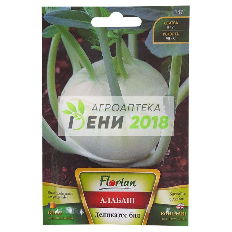 Алабаш деликатесен бял . Интересното при него е, че той се отглежда заради своето стъбло, което нараства и се удебелява значително, образувайки топчесто тяло с хрупкава консистенция. Обича хладен и влажен климат. Добре се развива при температура 17-22С. Високите над 25С температури се отразяват неблагоприятно на растежа му. Късното му отглеждане е по-рентабилно, получават се по-качествени стъблоплоди с добри вкусови качества и по-високо съдържание на захари. Алабашът има по-висока хранителна стойност от главестото зеле. Брането на Алабаша става след като достигне размер около 7 - 8 см в диаметър. Предимство на този сорт е, че дори да оставите леко да прерасне, растението няма да загуби своите вкусови качества и хрупкавост. Консумира се в прясно състояние. Указания за отглеждане: Семената се засяват: При ранно производство 15 – 20 февруари (отопляемо) При късно производство 5 – 15 юни на открито Разсаждането при ранно производство е около 20 март – 5 юни, а при късното от 10 до 15 юли. Дълбочина на сеитба: 1,5 -2 см Сеитбена норма: 60-70 гр./дка Разфасовка: 3гр. Семена в един грам: 300 – 350 бр. Семена в една опаковка: 900 – 1050 бр.