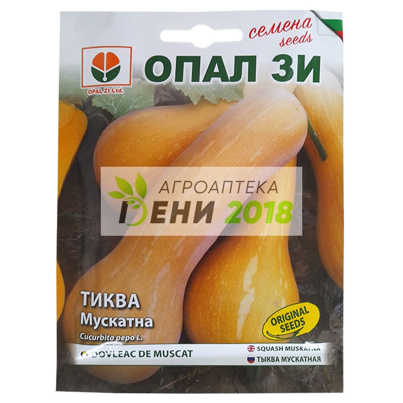 Тиква Мускатна. Атрактивен, високодобивен италиански сорт, отличаващ се с много едри плодове, достигащи тегло 8-10кг. Плодовете са сферични, леко сплеснати, с формата на цигулка. На цвят са сиво-синкави с по-светли ивици. Месестата част е от жълто до ярко оранжева, сочна и сладка. Сортът е с отлични вкусови качества. Образува дълги, силни облистени стъбла и мощна коренова система. Плодовете са големи и крушовидни с тегло 7-8 кг. Кожицата на плода е слабо сегментирана и гладка. В техническа зрялост плодът има оранжев цвят. Месестата част е оранжева, крехъка с високо съдържание на каротин. Вегетационен период: 130-135 дни Указания за отглеждане: Семената се засяват: Пролетно: 10-25 април Дълбочина на сеитба: 6 – 7 см Разстояние: 200-200 см Сеитбена норма: 0,35 – 0,60 кг/дка Оптимално температура на почвата за поникване: 10оС Разфасовка: 5 гр. Семена в 1гр : 3 - 5 бр. Семена в една опаковка: 15 - 25 бр.