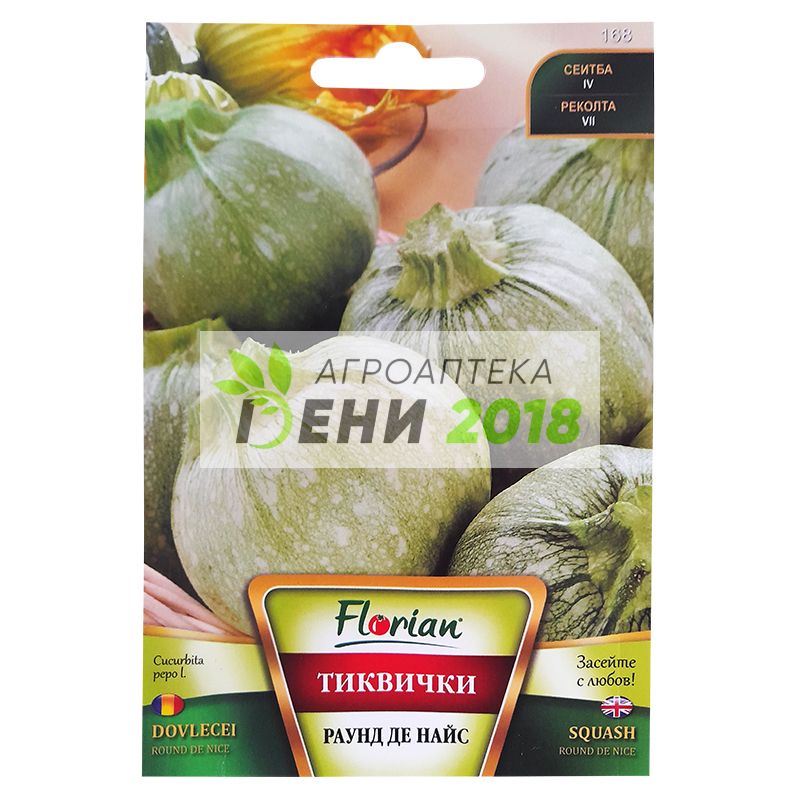 Тиквички Раунд де Найс. Формата на тиквички Раунд де Найс е кръгла, а цвета им е бледозелен. Обират се, когато достигнат размери около 10 см в диаметър. Отличават се с отлични вкусови качества и атрактивен външен вид. Тиквичките Семената се сеят в редове с разстояние между тях от по 90 см. Във всеки ред се правят гнезда, между които се оставя разстояние от половин метър. Във всяко гнездо на дълбочина 5 – 6 см се засяват по 5 – 6 семена от кръглите тиквички. от този сорт се отглеждат на открито. Разсад от тиквите не е необходимо да се произвежда. Сеят се чрез директна сеитба на постоянните си места. Периода е 20 – 30 април (най-късно средата на май). Минимална температура на почвата необходима за поникване на семената е 10 градуса по Целзий. Сеитбена норма: За един декар с насаждения са необходими околf 250 – 450 грама семена Нето тегло – 3 гр. Семена в една опаковка – около 18 - 24 бр. семена.