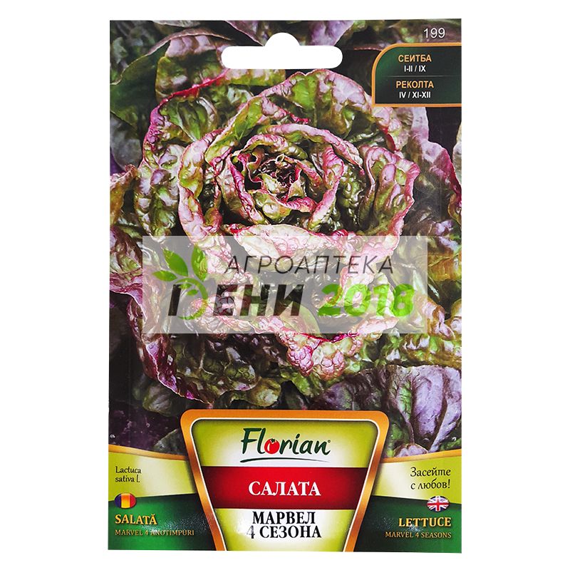 Салата Марвел 4 Сезона . Този сорт салата е ценена и се отглежда заради своята розетка тип маслена глава, която е много сочна, крехка и с перфектен вкус. Средно ранен сорт салата, формираща едра розетка. Салатката има характерни къдрави листа с периферно оцветяване в бронзово, златисто до червено. Много сочна, крехка и с перфектен вкус. Може да се отглежда в оранжерии или на открито. Подходящ сорт за директна сеитба на семената или чрез предварително подготвен разсад, Можете да сеете през две седмици, за да поддържате постоянно реколта от вкусната салата. Вегетационен период: 60 - 65 дни Указания за отглеждане: Семената се засяват: Пролетно: 25 януари – 05 февруари Есенно: 10 – 20 септември Семената се разсаждат: Пролетно: 1 10 март Есенно: 20 – 25 октомври Дълбочина на сеитба: Пролетно: 1 – 1,5 см Есенно: 1 – 1,5 см Разстояние: Пролетно: 30/20 см Есенно: 30/20 см Сеитбена норма: Пролетно: 40 50 гр/дка Есенно: 40 50 гр/дка Оптимално температура на почвата за поникване: 3оС Разфасовка: 2 гр. Семена в 1гр : 700 - 900 бр. Семена в една опаковка: 1400- 1800 бр. Забележка: годно до 01.2022