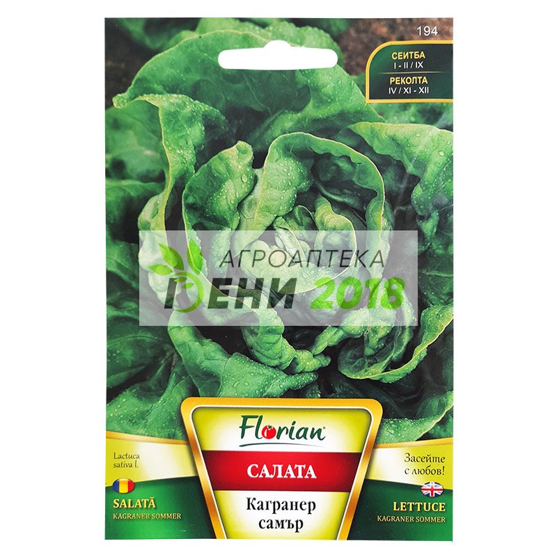 Салата Кагранер самър . Този сорт салата е отличен избор ако харесвате крехки, хрупкави и сочни салати тип зимна маслена глава. Салата тип маслена глава, подходяща за пролетно и есенно производство. Формира средно едри, кръгли глави от крехки и сочни листа с приятен маслен вкус. Сортът е с много добра устойчивост на високи температури и стелкуване. Може да се отглежда в оранжерии или на открито. Подходящ сорт за директна сеитба на семената или чрез предварително подготвен разсад, Можете да сеете през две седмици, за да поддържате постоянно реколта от вкусната салата. Вегетационен период: 55 - 60 дни Указания за отглеждане: Семената се засяват: Пролетно: 25 януари – 05 февруари Есенно: 10 – 20 септември Семената се разсаждат: Пролетно: 1 10 март Есенно: 20 – 25 октомври Дълбочина на сеитба: Пролетно: 1 – 1,5 см Есенно: 1 – 1,5 см Разстояние: Пролетно: 30/20 см Есенно: 30/20 см Сеитбена норма: Пролетно: 40 50 гр/дка Есенно: 40 50 гр/дка Оптимално температура на почвата за поникване: 3оС Разфасовка: 3 гр. Семена в 1гр : 700 - 900 бр. Семена в една опаковка: 2100- 2700 бр.