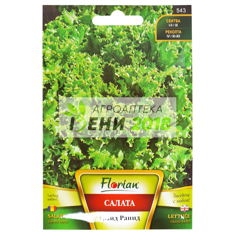 Салата Гранд Рапид . Този сорт е тип зелена къдрава салата, с много крехки и вкусни листа. Гранд Рапид е ранен сорт. Главите са средно големи. Листата са светлозелени, къдрави, дълбоко нарязани, крехки и вкусни. Може да се отглежда в оранжерии или на открито. Подходящ сорт за директна сеитба на семената или чрез предварително подготвен разсад, Можете да сеете през две седмици, за да поддържате постоянно реколта от вкусната салата. Вегетационен период: 45 - 55 дни Указания за отглеждане: Семената се засяват: Пролетно: 25 януари – 05 февруари Есенно: 10 – 20 септември Семената се разсаждат: Пролетно: 1 10 март Есенно: 20 – 25 октомври Дълбочина на сеитба: Пролетно: 1 – 1,5 см Есенно: 1 – 1,5 см Разстояние: Пролетно: 30/20 см Есенно: 30/20 см Сеитбена норма: Пролетно: 40 50 гр/дка Есенно: 40 50 гр/дка Оптимално температура на почвата за поникване: 3оС Разфасовка: 3 гр. Семена в 1гр : 700 - 900 бр. Семена в една опаковка: 2100- 2700 бр.