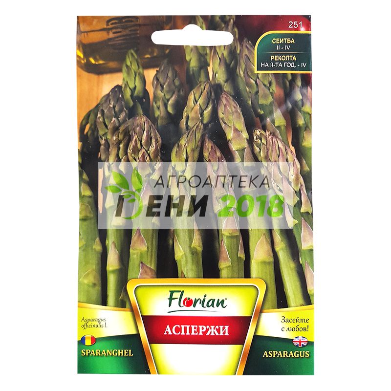 Аспержи . Това растение е не само мого вкусно но и има отлични качества. Многогодишно растение, което вирее дълго време на едно място. На втората година в почвата се образуват два месести корена, които са плодната част годна за консумация. Крехките и сочни корени е желателно да се обират ежедневно. Те са ценна диетична храна, богата на белтъчини, въглехидрати и витамини. Едно насаждение от аспержи се използва 15-20 години. Семената се засяват на закрито за производство на разсад през Февруари, а на открито - края на Март началото на Април. Разсажда се Юни - Август. Сейте на дълбочина 1-1,5см и на разстояние 20-25см едно от друго. Сеитбена норма: 1кг/дка Семена в един грам: 60бр. В опаковка: 1,5гр