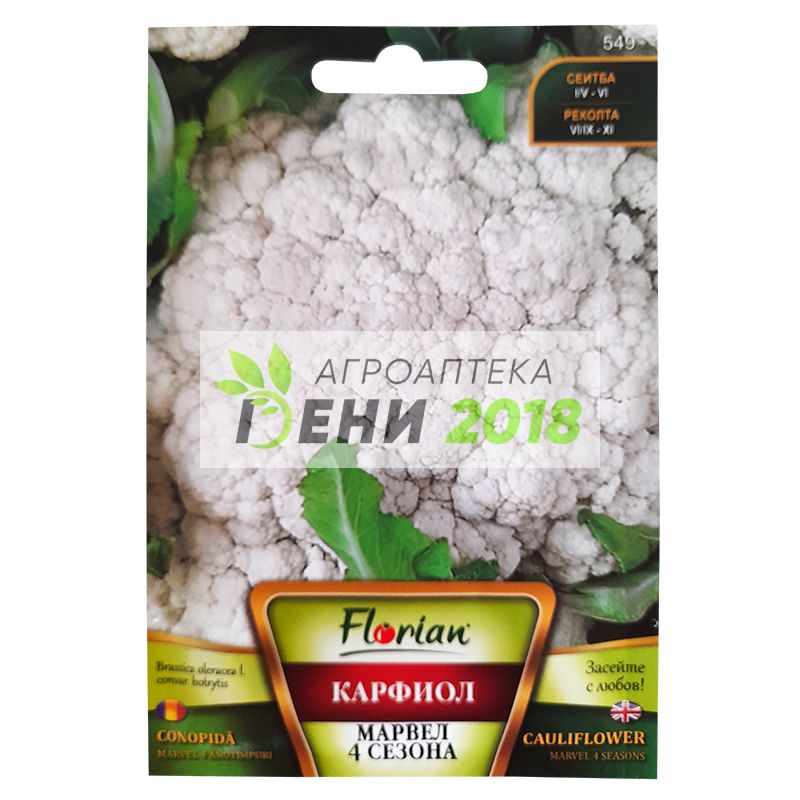 Карфиол Марвел 4 сезона . Този сорт карфиол се отличава с плътно покритата си със зелени листа обемна глава. Средно ранен сорт карфиол. Цветните глави са големи и бели на цвят, с елипсовидна до леко плоска форма, с тъмно зелени листа покриващи обемната глава, със средно тегло 1,8-2,2 кг. Вегетационен период: 110-130 дни. Указания за отглеждане: Семената се засяват: За ранно: 25 30 януари За късно: 25 май – 01 юни Дълбочина на сеитба: 1,5 - 2 см Разстояние: За ранно: 50/30 см За късно: 50/30 см Сеитбена норма: 50-60 гр/дка Оптимално температура на почвата за поникване: 10оС Разфасовка: 1,5 гр. Семена в 1гр : 300-350 бр. Семена в една опаковка: 450 - 525 бр.