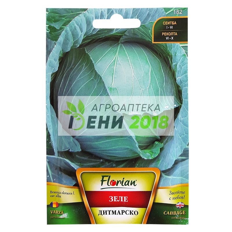 Дитмарско бяло главесто зеле. Това е ранен сорт семена, които образуват малка и компактна полуизправена розетка. Зелето е с овална форма, като средното тегло на една зелка е около 1,5 – 2 кг. Този вид растения са топлолюбиви и влаголюбиви. Растенията са с период на вегетация около 98 – 110 дни. Сортовите семена на Дитмарското зеле може да засеете още през Февруари – Март или ако организирате по-късно пролетно производство – Април – Май. Зелките се отглеждат разсадно, като разстоянието м/у тях е добре да е 40 см, а м/у редовете 60 см. Бялото главесто зеле има завиден добив – около 2,5 до 3 т/дка. Спецификация Технически характеристики Сеитбена норма 50 – 60 гр./дка Време на засяване За ранно производство засейте Февруари – март, за средно ранно производство – Април – Май. Време за пикиране на открито През май. Разстояние едно от друго Разсада се засажда в редове, като разстоянието м/у растенията е около 40 см, а м/у редовете 60 см. Период на плодоносене Май до Септември. Вид отглеждане В редове. Добив 2,5 – 3 тона/дка. Плодове Овални с тегло около 1,5 – 2 кг. Брой семена в 1 грам В 1 грам има приблизително 250 бр. семена.