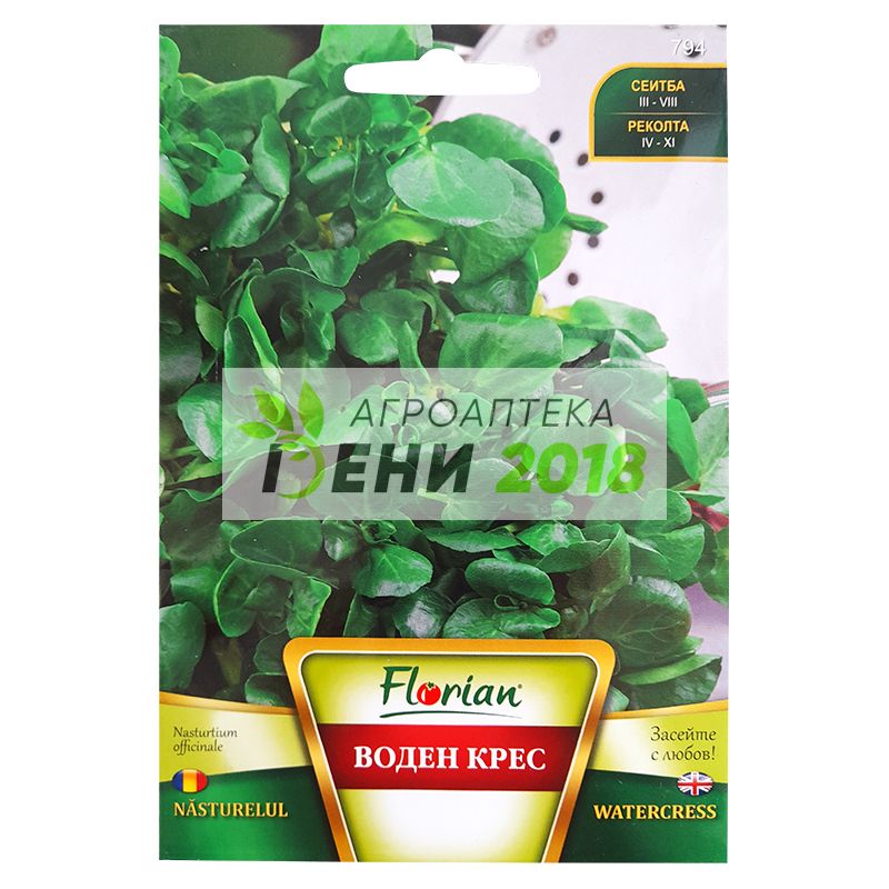 Семена на воден крес (Nasturtium officinale). Многогодишното растение се отглежда във влажни почви и се обира докато е младо, за да не стане с горчив вкус. Листата на водния крес са овални и на цвят - тъмнозелени, сочни са и имат пиперлив вкус. Пикантните листенца са чудни за свежи салати и трябва да се консумират много бързо, понеже не търпят продължително съхранение. Този крес съдържа антиоксиданти и витамини А и В. Източник е на специфичното етерично синапено масло, което има имунозасилващо действие. Има изключително кратка вегетация – 15 – 20 дни. Засейте семената от воден крес във влажни, но отцедливи почви, с добър хранителен запас и на полусенчесто място. Интересно е, че тази водна билка произхожда от речни и водни региони в Европа, Северна Африка и дори Азия! Била е известна на древните римляни, понеже е много полезна. Идеално се съчетава с доматите в сандвичите и в рибни сосове. Някои хора оприличават вкуса на креса с този ...