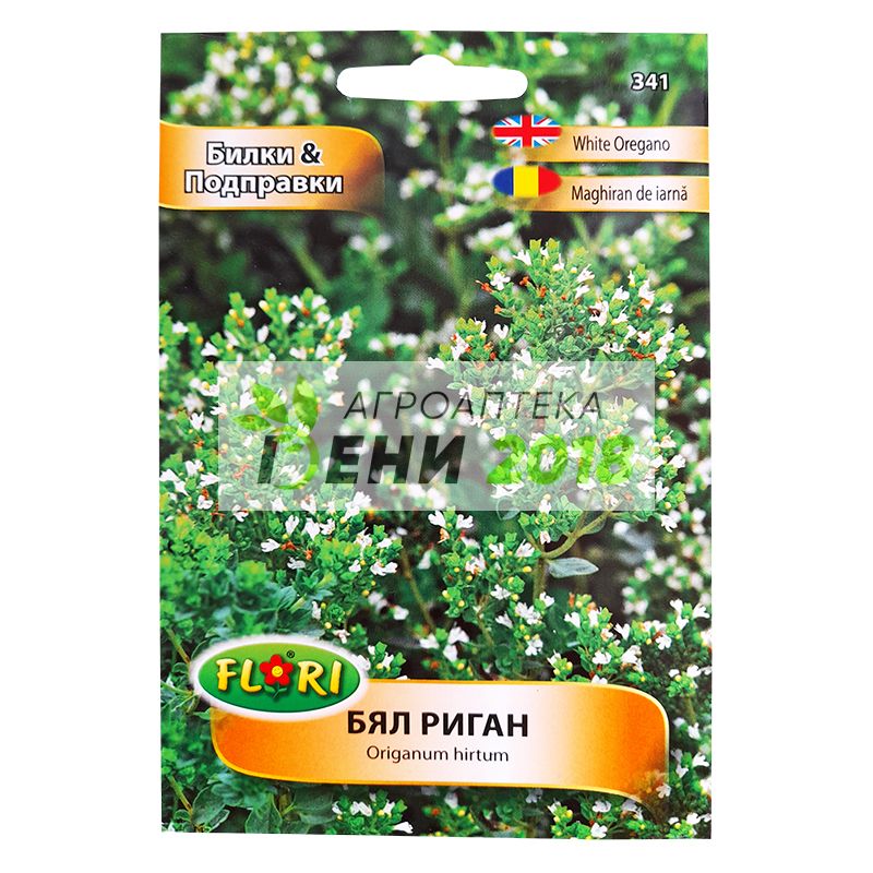 Бял Риган е многогодишно тревисто растение от семейство Устоцветни. Достига на височина до 80 см. В диво състояние е разпространен в цялата страна по поляни, горски сечища, просветлени гори до 2000 м надморска височина. Когато се култивира, се подбират топли и слънчеви места и леки, пропускливи почви. Бере се във фаза на пълен цъфтеж, когато процентът на етеричното масло е най-висок. Използва се надземната част на растението – листата, цветовете и стъблото. Суши се на сянка или в сушилня до 35 градуса. Изсушената билка има зелено обагрени стъбла и листа. След изсушаване запазва аромата си. Най-популярната му употреба в кухнята е за пици и тестени изделия. Използва се също като подправка към наденици и печено месо, за рибни ястия, блюда с яйца, супи и сосове. Като лечебна билка има антисептично, отхрачващо, антиспастично и успокояващо нервната система действие. Използва се при възпаление на дихателните пътища, като успокояващо кашлицата средство, при стомашни болки, чернодробни и жлъчни заболявания. Прилага се под формата на чай.