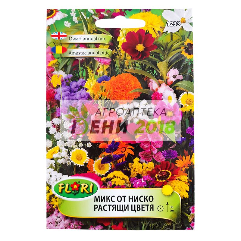 Микс за ниско растящи цветя. Сортови семена на ниско растящи цветя (достигат височина 30 см). Този интересен микс от семена ще Ви изненада с едни от често отглежданите в двора и в градината цветя като Тагетес, Мушкато, Кученце, Вербена, Невен, Календула и др. Миксът от семена на нискорастящи цветя е добре да засеете на слънчево място, а колкото до почвата, то тя задължително трябва да има добър хранителен запас и дренаж. Перфектното време за засяване на семената са месеците април и май. Ниските цветя ще Ви радват с цветове през целия активен сезон (тъй като са различни видове цъфтят поетапно). Цвят Микс различни цветове (оранжеви, жълти, червени, розови и др.) Височина 30 см. Период на цъфтеж През целия активен сезон се редуват да цъфтят различни нискорастящи цветя. Изискване към светлина Слънчево място.