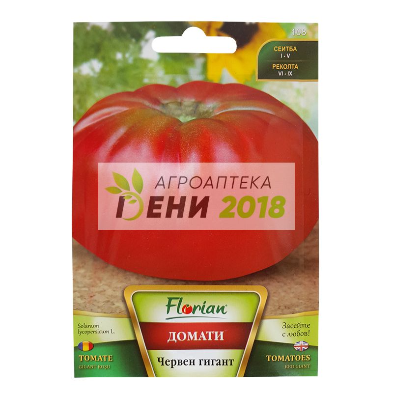 Средно ранен индетерминантен сорт, предназначен за открити площи. Плодовете им имат ярко червен цвят и обла форма. Домати сорт червен гигант достигат невероятните размери до 1,500 кг, като средното теголо е 400 - 800 гр.! Изключително вкусни, тези гигантски градински домати са включени в нашата специална селекция на сортове, които възраждат автентичния вкус на стария български домат. Прекрасни освен за салата, също и за кетчуп, доматено пюре и любимата на всички българи – лютеница.