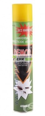 ДЕМОР СПРЕЙ ПРОТИВ НАСЕКОМИ БЕЗ МИРИЗМА 400 мл Предназначение: За унищожаване на хлебарки, бълхи, мравки, мухи, комари, молци, оси, мушици и други насекоми. Приложение: За масова и професионална употреба в жилищни помещения, здравни и лечебни заведения, търговски обекти, хранителна промишленост, индустриални и обществени сгради,селскостопански обекти. Главна група 3: Контрол на вредители Подгрупа 18: Инсектициди, акарициди и биоциди з борба с други членестоноги. Състав: D-fenothrin - 0.072 % ; D-tetramethrine - 0.2 %; Propellent - 40 % Предупреждения за опасност: Н220 Изключително запалим газ. Н400+Н410 Силно токсичен за водни организми, с дълготраен ефект. Начин на приложение: Преди употреба флаконът се разклаща добре. Срещу пълзящи насекоми - напръскват се директно местата, където насекомите се крият и се движат от разстояние 30-40 см до омокряне на повърхностите. Помещението остава затворено за 15 минути, след което се проветрява. Обработката се повтаря, ако е необходимо след 4 седмици. Срещу летящи насекоми - пръска се във въздуха при отсъствие на хора и животни. Помещението се уплътнява, прозорците се затварят. Пръскането започва от най вътрешната част и завършва при вратата. Разход на препарата: от 7-10 секунди за помещение от 35-40 куб.м. След обработката помещението остава затворено за около 30 минути. Достъпът на хора и животни - след добро проветряване в продължение на 1 час. Препоръки за безопасност: Р102 Да се съхранява извън обсега на деца. Р210 Да се пази от топлина/искри/открит пламък/вагорещени повърхности. Тютюнопушенето забранено. Р261 Избягвайте вдешване на аерозола. Р273 Да се избягва изпускане в околната среда. Р302+Р352 При контакт с кожата: измийте обилно със сапун и вода. Р333+Р313 При проява на кожно дразнене или обрив на кожата: потърсете медицински съвет /помощ. Р501 Съдържанието / съдът да се изхвърли в съответствие с нормативната уредба. Внимание: Съд под налягане7 да се предпазва от пряка слънчева светлина и да не се подлага на въздействие на температури превишаващи 50С. Да не се пробива или изгаря дори и след употреба. Да не се пръска рещу открит пламък или всякакъв нажежен материал. Да се държи на разстояние от запалителни източници. Да не се пуши. Да се пази далеч от деца. Разрешително: 1327-2/01.04.2016 год. Опаковка: 400 мл