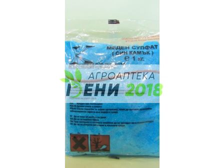 Син камък .Състав: мин. 99.1% МЕДЕН СУЛФАТ (СИН КАМЪК) - дребни кристали със син цвят Приложение: • за отстраняване на недостатъци във вкуса или в миризмата на виното в максимално количество до 1 грам на хектолитър, при условие че така обработеният продукт има съдържание на мед не повече от 1 милиграм на литър (Наредба за разрешените енологични практики и обработки и контрола на тяхното извършване - Чл. 7 т. 20); • за приготвяне на бордолезов разтвор – 1%-ов - 100 г меден сулфат, разтворен в 9 л вода се неутрализира със 75 г негасена вар, разтворена в 1 л вода – варното мляко се филтрира и се излива бавно в разтвора на синия камък при непрекъснато бъркане; 2%-ов – 200 г меден сулфат, разтворен в 9 л вода се неутрализира със 150 г негасена вар, разтворена в 1 л вода; • за предотвратяване на „позелевяване“ (развитие на водорасли) в саксии за цветя; • за предпазване от позеленяване от водорасли на водни повърхности на селскостопански водоеми – 50 ppm; • за предпазване от копитен гнилец при овце и крави – 1 кг/10 л вода за „копитна баня“ през която животните преминават; • за предпазване на дървени каси за плодове, тарини за разсад и други контейнери от дърво или дървен материал – накисване в 8%-ов разтвор (800 г/10 л вода); • за предпазване от развитие на лишеи, плесени и подобни върху азбестоциментови покриви или други сградни повърхности - 850 г/10 л вода - прилага се с пръскачка.