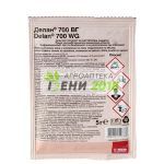 Делан 700 ВГ .Механизъм на действие: контактен кинонов фунгицид с предпазно и частично лечебно действие РАЗРЕШЕНИ УПОТРЕБИ Ябълки - Струпясване 50г/дка или 0.035% в комбинация със Строби ДФ/Дискус ДФ - 0.02%Лозя - Мана – 0.05%; Екскориоза 50г/дка Костилкови - праскови - Ранно кафяво гниене – 50г/дка Кайсии - Гномония – 50г/дка Череши - Бяла ръжда – 50г/дка Карантинен срок (дни): 20; 35 за ябълки