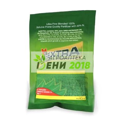 N-EXTRA 30-5-5 TE Специален продукт за подхранване N-EXTRA 30-5-5 TE е уникален и ефикасен продукт за подхранване на растенията, който съдържа 30% УРЕЯ – с ниско съдържание на биурет и високо съдържание на микроелементи. Предимства: – N-EXTRA 30-5-5 TE е специално създаден за листно подхранване – N-EXTRA контролира стрес и всякакъв тип хлороза директно и ефикасно – N-EXTRA 30-5-5 TE има високо съдържание на микроелементи (напр. Fe EDTA 0,77% и Fe EDDHMA 0,18%) – Приложенията с N-EXTRA 30-5-5 TE веднага подобряват цвета на листата – N-EXTRA е особено ефикасен при разсади и млади растения – N-EXTRA силно подобрява ефекта на препаратите за растителна защита, поради по-доброто им усвояване. Дозиране: – 2 – 4 кг / 1000 л вода – Рано сутрин или късно вечер, когато растенията имат спешна нужда допълнително хранителни вещества или изпитват стрес. – Повтаряйте всеки 7 дни докато растенията се възстановят и изглеждат силни и здрави отново. – Пръскайте с по-ниски дози за лекуване на хлороза и други видове недостиг (на Fe, Zn, Mn, Cu, Mo, Mg) и за незабавно подобрение на цвета на листата. – Пръскайте с по-високи дози за лекуване на хлороза и ускоряване на вегетативния растеж. Съдържа микроелементи: Желязо (Fe) EDTA: 0,77% Желязо (Fe) EDDHMA: 0,18% Цинк (Zn) EDTA: 0,50% Манган (Mn) EDTA: 0,50% Мед (Cu) EDTA: 0,50% Бор (B): 0,50% Молибден (Mo): 0,075% Манган (Mg): 1,00%