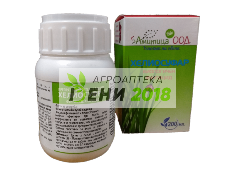 Хелиосуфр С“ е един продукт използван от френските зърнопроизводители. Уникалната течна формулация на сяра в комбинация с борови терпени, го прави високоефективен срещу патогените на брашнеста мана при зърненожитните култури, лозя, зеленчукови култури и трайни насаждения, както и струпяването по ябълка и череша . търговско наименование ХЕЛИОСУФР С тип фунгицид, акарицид Активни вещества сяра 700 г/л производител Аксион Пен Категория на употреба втора професионална Показатели и дйствие на продукта: Кое прави Хелиосуфр С специален? Може да се ползва от началото на сезона /стадии„миши уши“/до края на вегетацията. Иновативна концепция, която поддържа овощните насаждения здрави в най-опасните стадии на развитие на струпясване и брашнеста мана. Повишава имунитета на растенията. Контактно действие срещу акари. Уникалната му комбинация на органична сяра и борови терпени го прави изключително ефективен. Тежките капки на боровите терпени осигуряват: Добро покритие, разпръскване, прилепване. Осигурява защита от отмиване, винаги отлични резултати и ефективност. Подобряват качеството на сместа и увилчават ефикасността на продуктите. Дълго последействие. Всичко това води до намаляване на броя пръскания и намаляване на дозите. Включен в националната програма за борба с брашнестата мана в овощните насаждения. Култура Вреда Доза Допълнителна информация Каран. срок Пшеница Брашнеста мана 400 - 600 мл/дка Внася се във фаза BBCH 30-59 (начало на удължаване на стъблото-край на изкласява-нето:класът напълно се е показал от влагалището на флаговия лист) Брой мин/макс приложения – 1-2 Интервал между приложенията – 10 Вода л/дка – 8-25 л/дка 3 дни Ечемик Брашнеста мана 400 - 600 мл/дка Внася се във фаза BBCH 30-59 (начало на удължаване на стъблото-край на изкласява-нето:класът напълно се е показал от влагалището на флаговия лист) Брой мин/макс приложения – 1-2 Интервал между приложенията – 10 Вода л/дка – 8-25 л/дка 3 дни Тритикале Брашнеста мана 400 - 600 мл/дка Внася се във фаза BBCH 30-59 (начало на удължаване на стъблото-край на изкласява-нето:класът напълно се е показал от влагалището на флаговия лист) Брой мин/макс приложения – 1-2 Интервал между приложенията – 10 Вода л/дка – 8-25 л/дка 3 дни Овес Брашнеста мана 400 - 600 мл/дка Внася се във фаза BBCH 30-59 (начало на удължаване на стъблото-край на изкласява-нето:класът напълно се е показал от влагалището на флаговия лист) Брой мин/макс приложения – 1-2 Интервал между приложенията – 10 Вода л/дка – 8-25 л/дка 3 дни Лоза Брашнеста мана 300 - 750 мл/дка Внася се във фаза BBCH 19-83 (9 и повече листа са отворенизърната формират цвят) Брой мин/макс приложения – 2-12 Интервал между приложенията – 7 Вода л/дка – 8-100 л/дка 5 дни краста 750 мл/дка Внася се във фаза BBCH 07-65 (начало на разпукване на пъпките:показ ват се зелени връхчета-масов цъфтеж:50% опадане на ресите) Брой мин/макс приложения – 1-4 Интервал между приложенията – 7 Вода л/дка – 8-100 л/дка Домати Брашнеста мана 150 - 600 мл/дка Внася се през цялата вегетация Брой мин/макс приложения – 2-6 Интервал между приложенията – 7 Вода л/дка –30-100 л/дка 3 дни акари 150 - 750 мл/дка Круша Брашнеста мана 150 - 500 мл/дка Внася се преди и след цъфтеж Брой мин/макс приложения – 2-12 Интервал между приложенията – 7 Вода л/дка –50-150 л/дка 3 дни Струпясване 200 - 700 мл/дка Дюля Брашнеста мана 150 - 500 мл/дка Внася се преди и след цъфтеж Брой мин/макс приложени